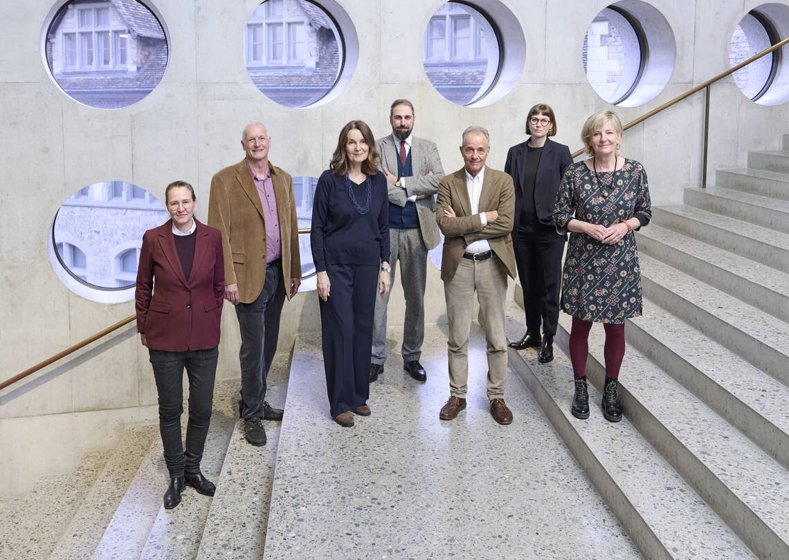 from left to right: Larissa Bieler* (Vice-President, Director SWI swissinfo.ch, SRG SSR, Berne and Executive Board member SRG SSR, Berne), Theo Mäusli (Member, Former project manager and expert in innovation and offerings at SRG SSR; lecturer in media history at FernUni Switzerland and digital archives and broadcasting history at USI), Laura Sadis* (Member, former politician, economist, active in the non-profit sector), Roberto Zaugg (Member, Professor of Early Modern History at the University of Zurich), Tim Guldimann (President, political scientist, diplomat and politician), Vanessa Rüegger* (Member, Professor of Public Law at the University of Geneva), Marie-France Meylan Krause (Member, Archaeologist and former director of the Site et Musée romains d'Avenches). Absent in the photo: Andreane Jordan Meier (Member, lawyer and Director of Development and External Affairs at the Centre hospitalier universitaire vaudois in Lausanne)